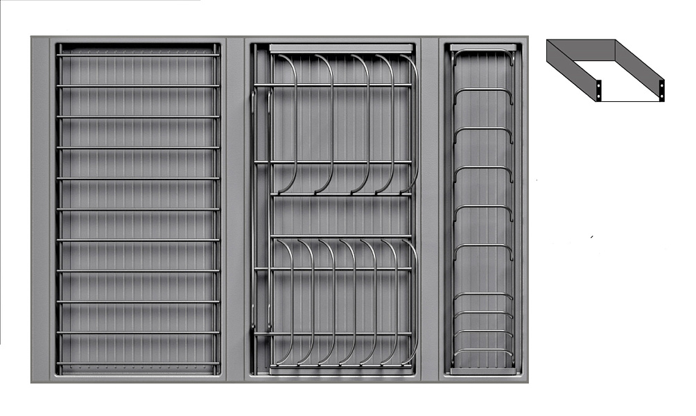 - 1 большой модуль для посуды + 1 большой модуль с решеткой + модуль для столовых приборов